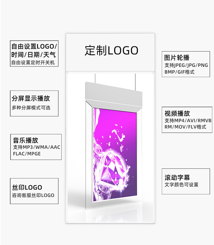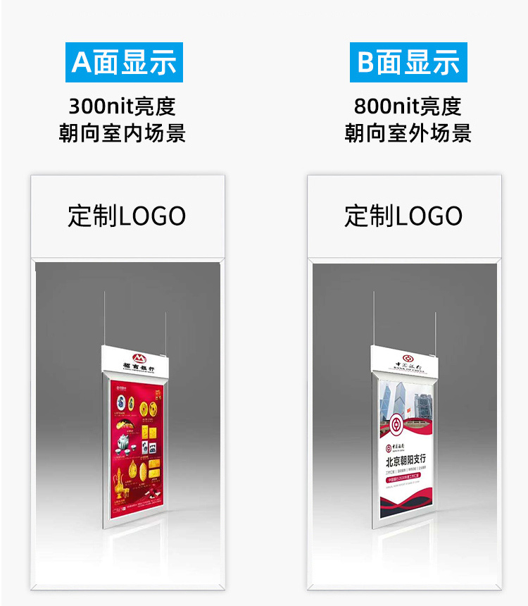 雙屏機(jī)兩面均有屏幕,可同步顯示畫面兩面亮度不同,智能適應(yīng)櫥窗場景