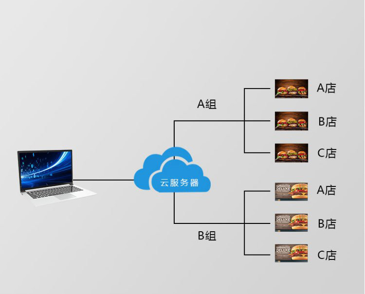 總部根據(jù)不同區(qū)域分店,可以將終端設(shè)置多個(gè)組別,易于管理;互聯(lián)網(wǎng)一鍵下發(fā)。