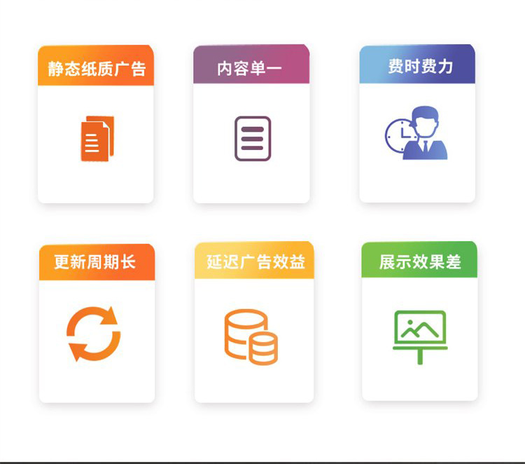 新產(chǎn)品上市無法第一時(shí)間進(jìn)行廣告展示,延遲了廣告效益靜態(tài)紙質(zhì)廣告 內(nèi)容單一 費(fèi)時(shí)費(fèi)力
