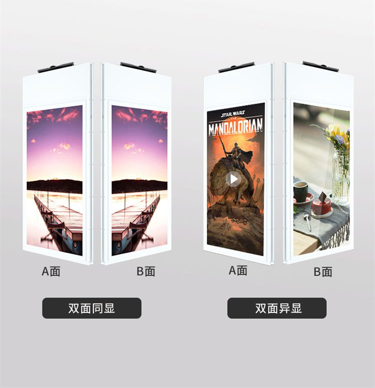 雙面同顯/異顯,受眾更廣,讓目標(biāo)受眾更精準(zhǔn)亮度內(nèi)側(cè)400cd/m2+外側(cè)800cd/m2,亮度可根據(jù)周圍環(huán)境自動(dòng)調(diào)節(jié)