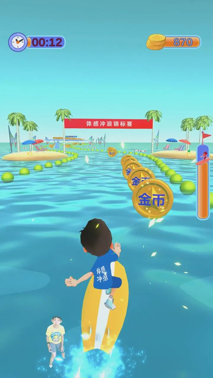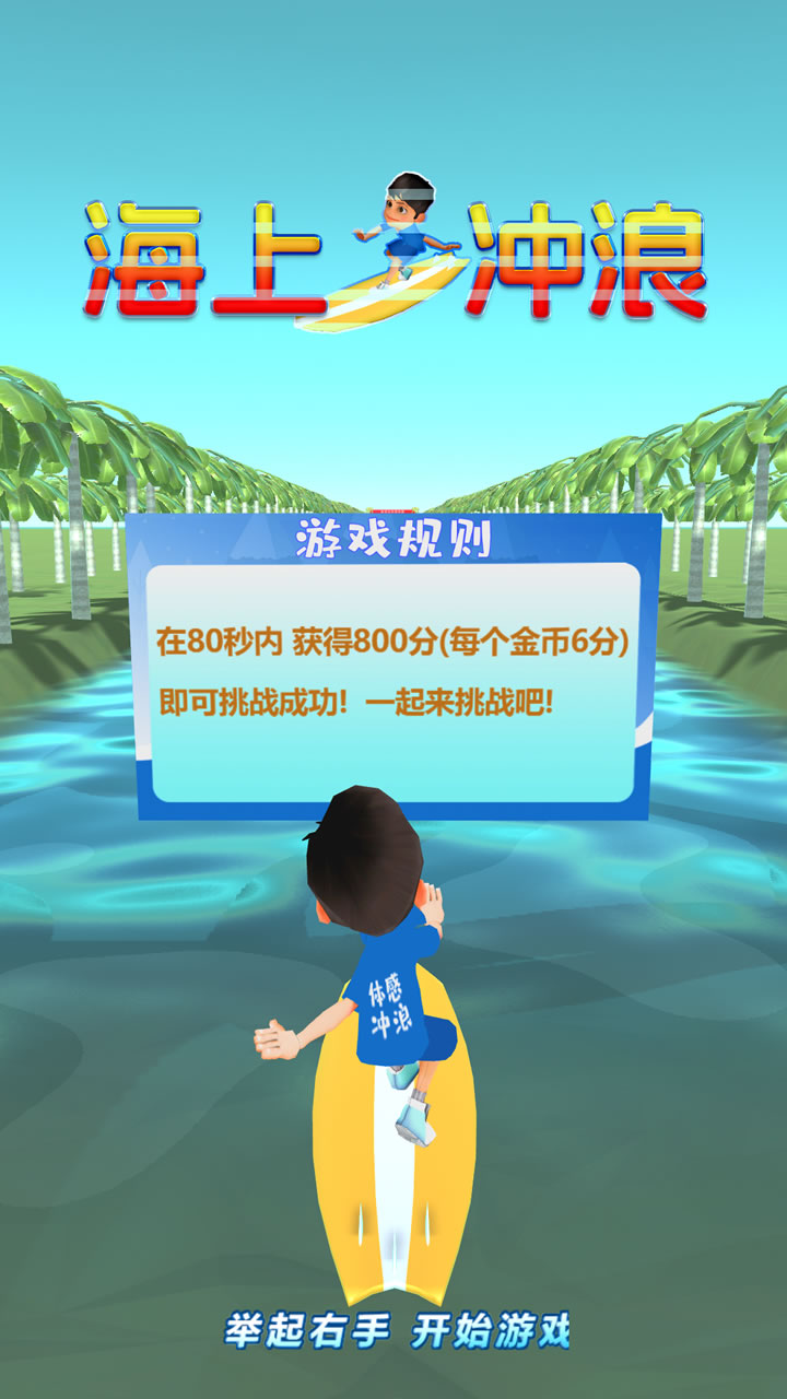 這是一款原創(chuàng)的【體感+沖浪】相結(jié)合的在蔚藍(lán)大海上進(jìn)行的一場互動沖浪游戲。