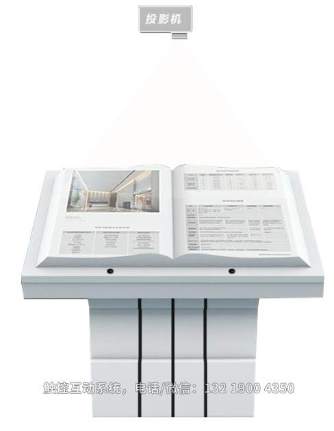 電子翻書主要由觸摸屏,書模,投影儀,三維數(shù)字內(nèi)容,利用紅外傳感技術(shù),計算機多媒體技術(shù),投影技術(shù)等技術(shù)來捕捉游客動作被發(fā)送到計算機進行處理,計算機中的應(yīng)用程序根據(jù)捕獲的信號執(zhí)行通過多媒體動畫翻書的效果。電子翻書中還有各種按鈕,包括返回,主菜單和上一頁瀏覽。