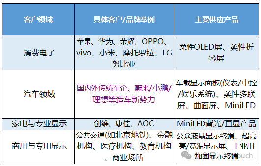 為智能手機(jī)、平板電腦、筆記本電腦、顯示器、電視等廠商提供顯示面板,如蘋果、華為、海信等。