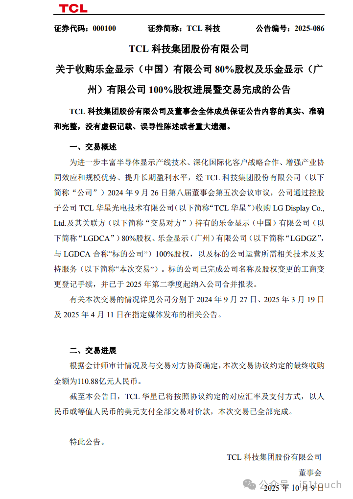 TCL 華星已按照協(xié)議約定,以人民幣或等值美元支付完成對價,交易已全部實施。