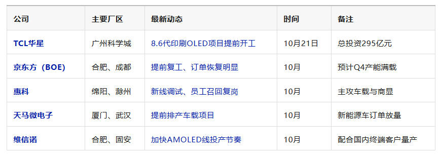 京東方、惠科、天馬等廠商均在國慶后快速恢復(fù)排產(chǎn),部分產(chǎn)線甚至進(jìn)入“加班趕產(chǎn)”狀態(tài)。
