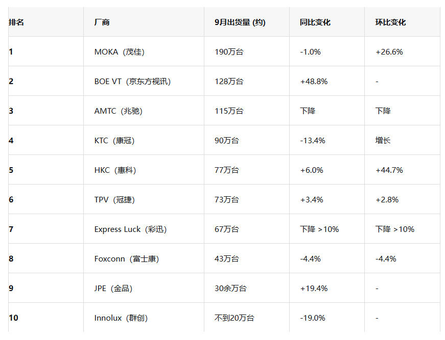 最大黑馬當(dāng)屬京東方視訊(BOE VT)——9月出貨128萬臺(tái),同比狂飆48.8%,連續(xù)三個(gè)月蟬聯(lián)“增長(zhǎng)王”。其背后的面板-整機(jī)一體化供應(yīng)鏈優(yōu)勢(shì)正持續(xù)發(fā)力。