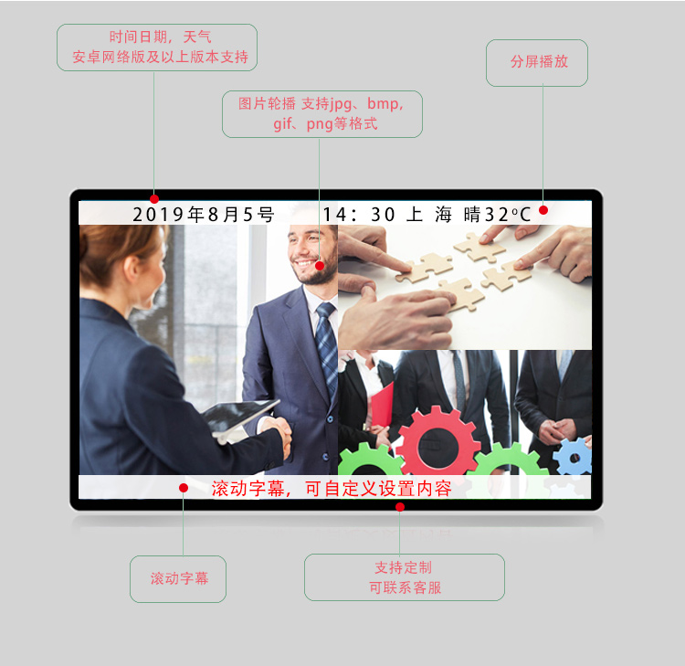分屏功能,自由選擇不同區(qū)域的顯示內(nèi)容,視頻、圖片、文字、天氣預(yù)報(bào)、企業(yè)logo等, 媒體內(nèi)容分區(qū)播放