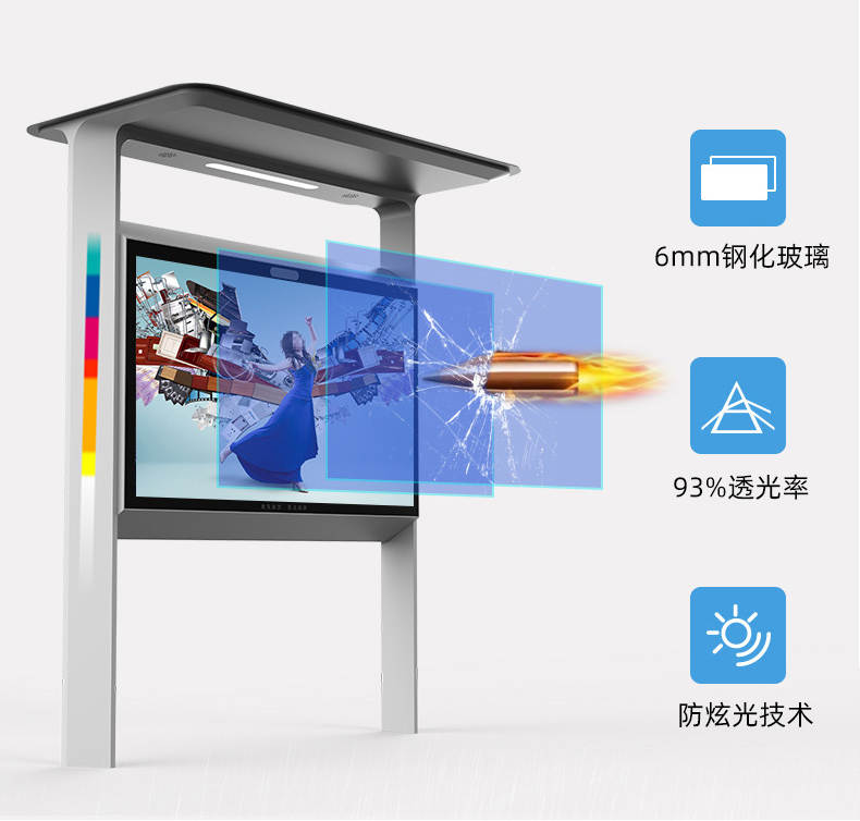 屏幕高清鋼化玻璃、防刮耐磨、畫(huà)質(zhì)細(xì)膩,色彩豐富鮮明公共場(chǎng)所投放利器。