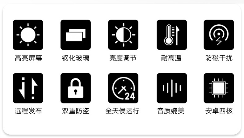 ● 高亮屏幕 ● 鋼化玻璃 ● 亮度調(diào)節(jié) ● 耐高溫 ● 防磁干擾