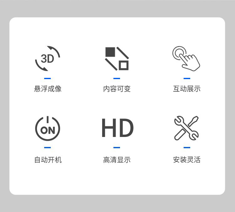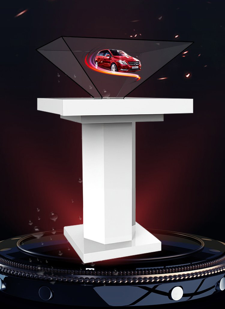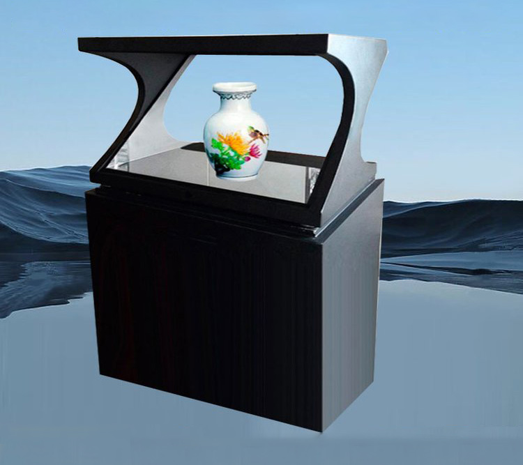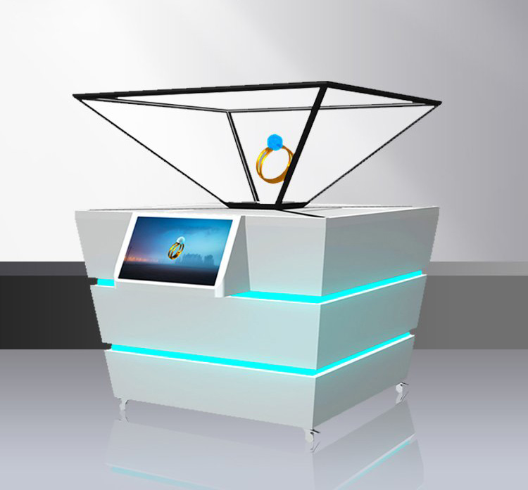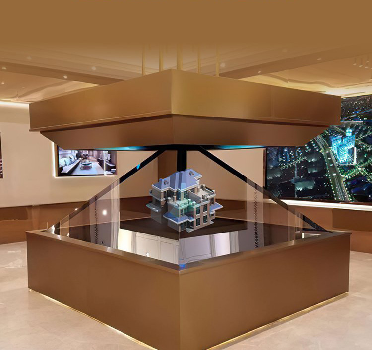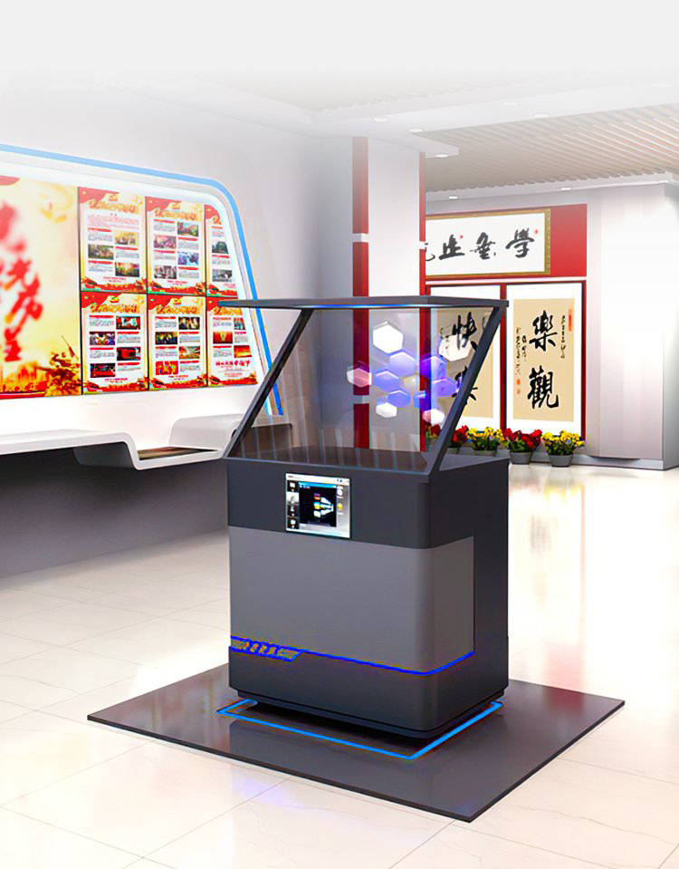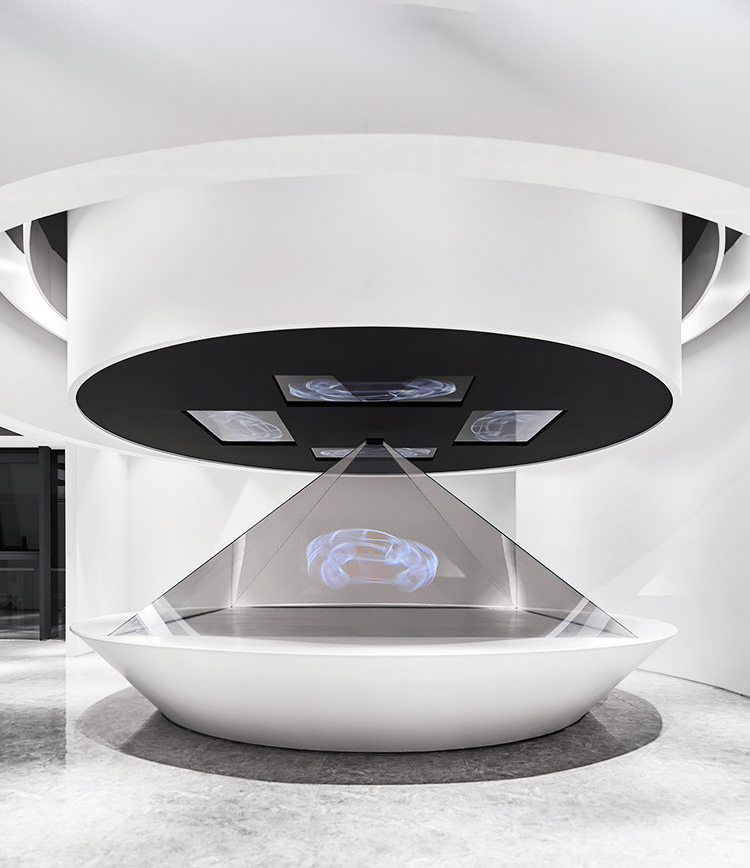 將三維畫面懸浮在柜體實景中的半空中成像,可多角度展示,給人以視覺上的沖擊。