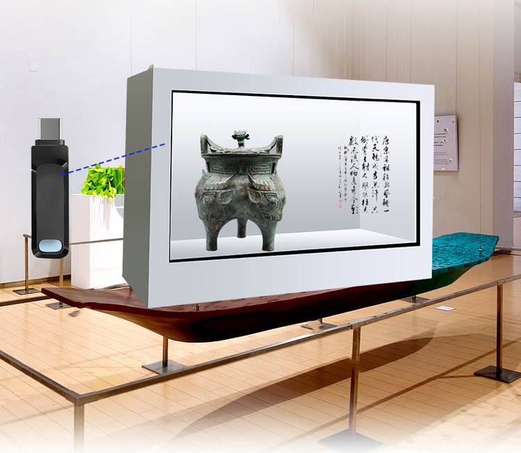 連接U盤通過電腦控制可以將事先做好的產(chǎn)品介紹或者其它圖文視頻同步播放,